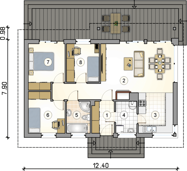 • 2. POKÓJ DZIENNY Z JADALNIĄ I KOMUNIKACJĄ 29,55 m²