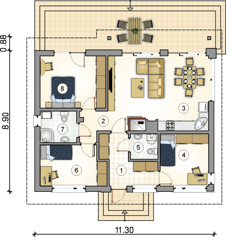 - 3. POKÓJ DZIENNY Z KUCHNIĄ I JADALNIĄ 29,55 m²